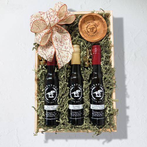 Need olive oil gift basket ideas? Shop Saratoga Olive Oil's gourmet olive oil and balsamic vinegar gift baskets. Makes gorgeous gifts for loved ones in your life at any price point. Perfect as presents for family members, friends, or colleagues alike - each carefully curated basket features premium-grade olive oils and balsamic vinegars handpicked for their exceptional flavors and versatility. Each premium gift basket is beautifully arranged and features a variety of flavors like garlic, basil, cranberry pear, Tuscan herb, and more.