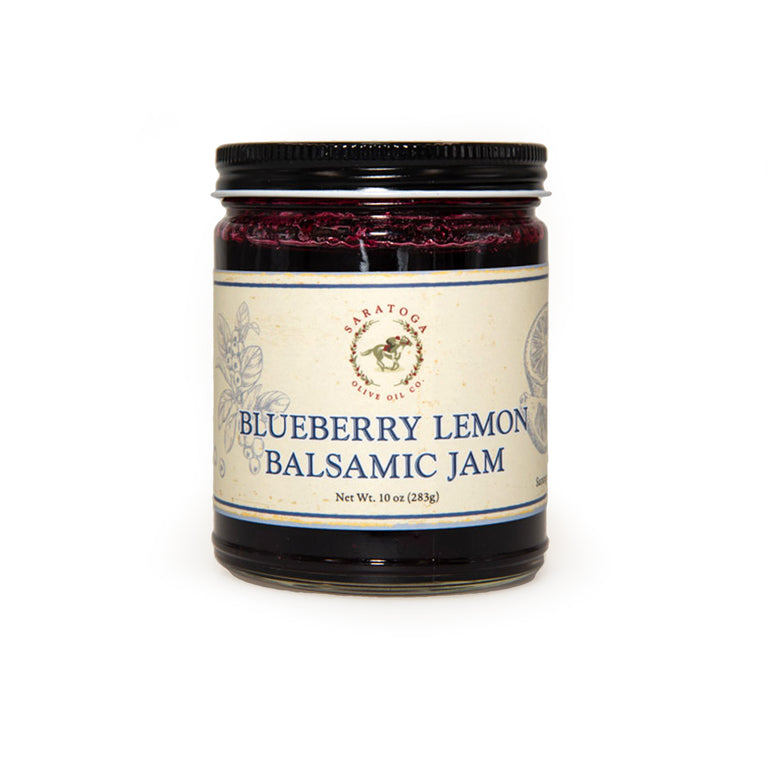 Blueberry Lemon Balsamic Jam: Blueberries, Sugar, Glace Lemon Peel, Lemon Juice, Saratoga Olive Oil Co. Blueberry Balsamic Vinegar, Fruit Pectin, Lemon Extract