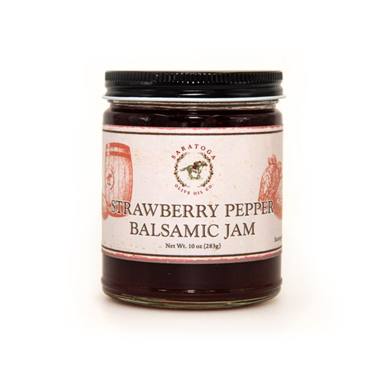 Strawberry Pepper Balsamic Jam: Looking for a strawberry jam with a savory twist? Then try this mixture of sweet, sun-ripe strawberries tamed by a warm black pepper spice. Try on a hot English muffin and let the fruity goodness ooze into every nook and cranny. The Strawberry Pepper Balsamic Jam is made with our very own 18-Year Traditional Balsamic Vinegar.