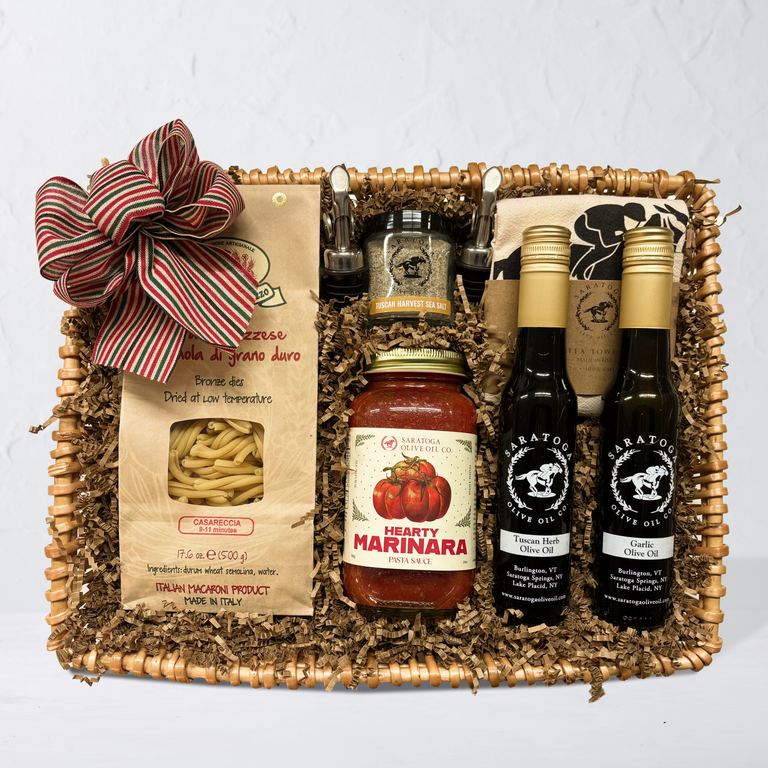 This gourmet pasta gift basket is the perfect starter gift for your family and friends. It includes a selection of everything you need for an easy and gourmet dinner for two, including two of our best-selling olive oils in limited-edition colorful bottles, a sea salt, a seasoning, authentic pasta and a gourmet sauce. Enjoy delicious and authentic Italian cuisine all beautifully wrapped in a stylish gift basket.