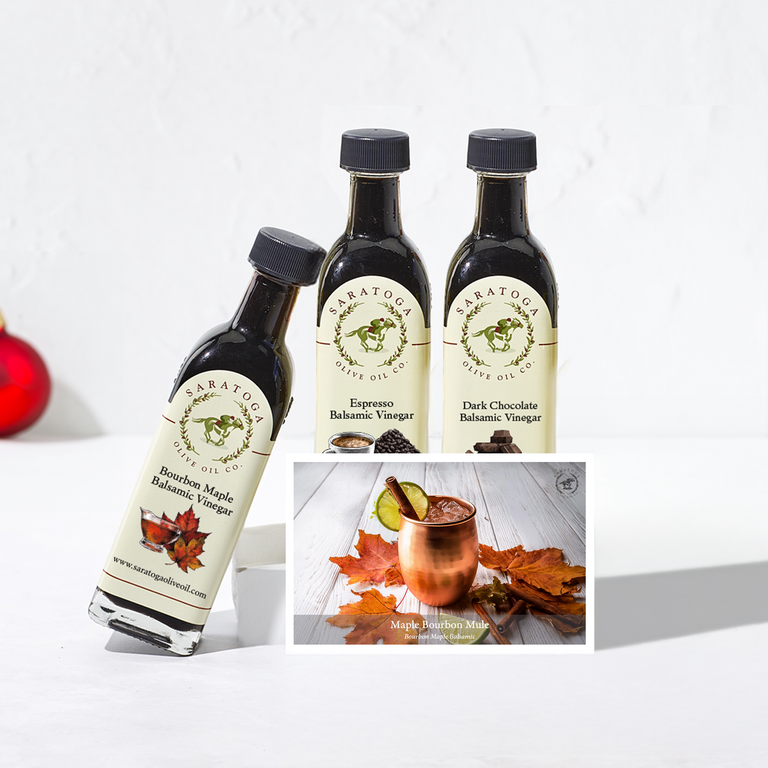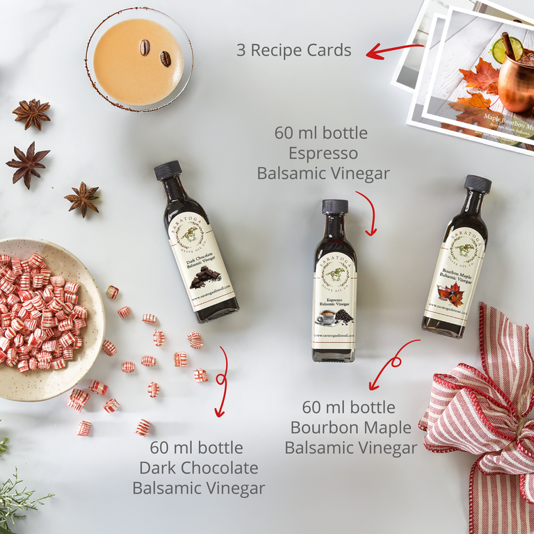This enticing collection features 60ml bottles of our Espresso Balsamic Vinegar, Dark Chocolate Balsamic Vinegar, and Bourbon Maple Dark Balsamic Vinegar, each crafted to add a unique twist to your cocktails.