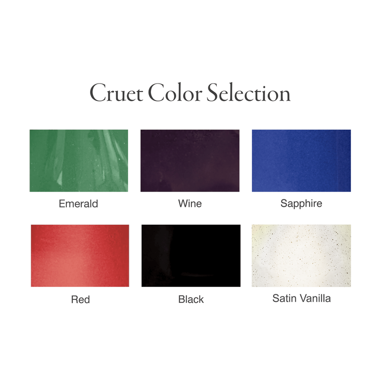 Choose your favorite color! All cruets come with a self-pouring spout.