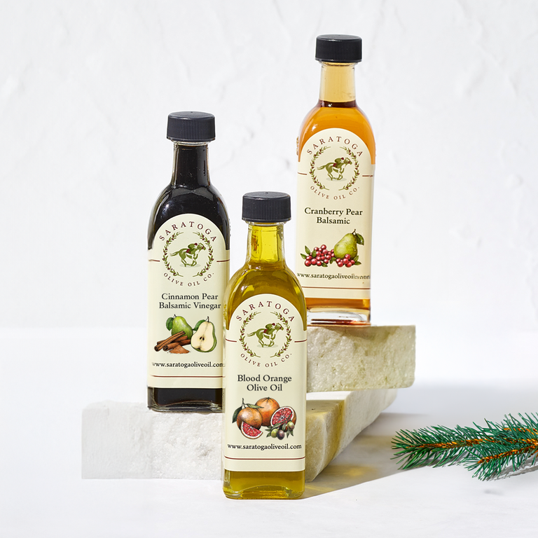 Then add the finishing touch with our Cranberry Pear White Balsamic Vinegar which adds a tart twist to hearty grain salads and holiday cocktails.
