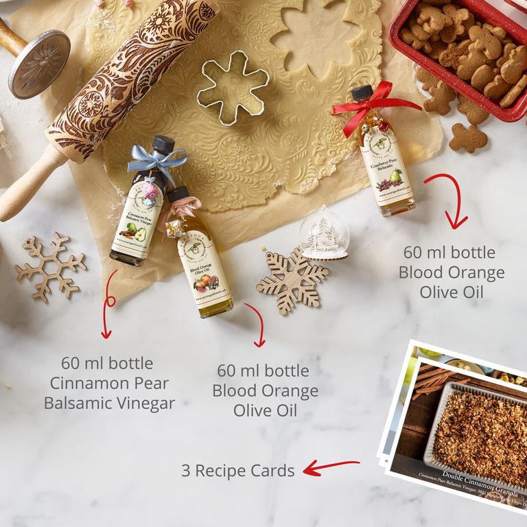This delightful collection features 60ml bottles that will warm and delight your taste buds. Our spicy Cinnamon Pear Balsamic Vinegar is made from naturally sweet d’anjou pears and fresh ground cinnamon. Perfect for drizzling on roasted vegetables or as a glaze for holiday ham, this versatile vinegar will become a staple in your kitchen.