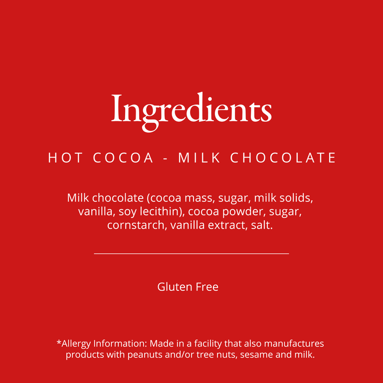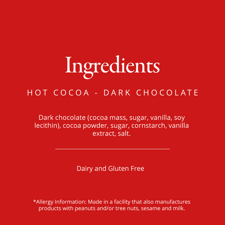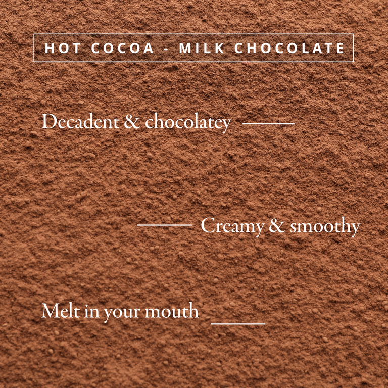 Both are made from high-quality cocoa beans, ensuring that every cup is a perfect balance of flavor and indulgence. Whether you prefer the classic creaminess of milk or the complex, bittersweet notes of dark, our hot chocolate promises a moment of warmth and luxury. Perfect for cozy nights, festive gatherings, or whenever you crave a bit of indulgence.