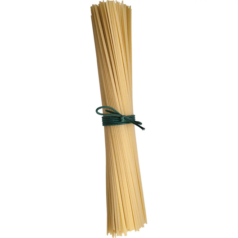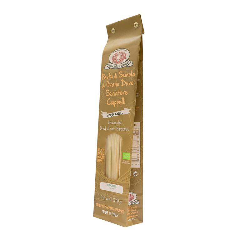Long and flattened in shape, similar to spaghetti, linguine is the "narrower" version of the renowned Ligurian bavette. The use of only organic "Senatore Cappelli" durum wheat semolina, bronze dyes, and long slow drying times at low temperatures make the texture of this pasta ideal for holding fish-based sauces such as linguine with clam sauce, Pescatora sauce, Abruzzo, shrimp linguine, or a classic of Ligurian cuisine such as Pesto alla Genovese.