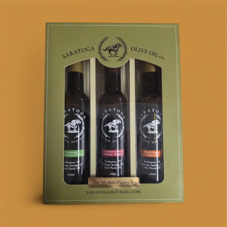 Gift set includes Cranberry Pear White Balsamic, Blood Orange Olive Oil and Cobrancosa Plain Extra Virgin Olive Oil.