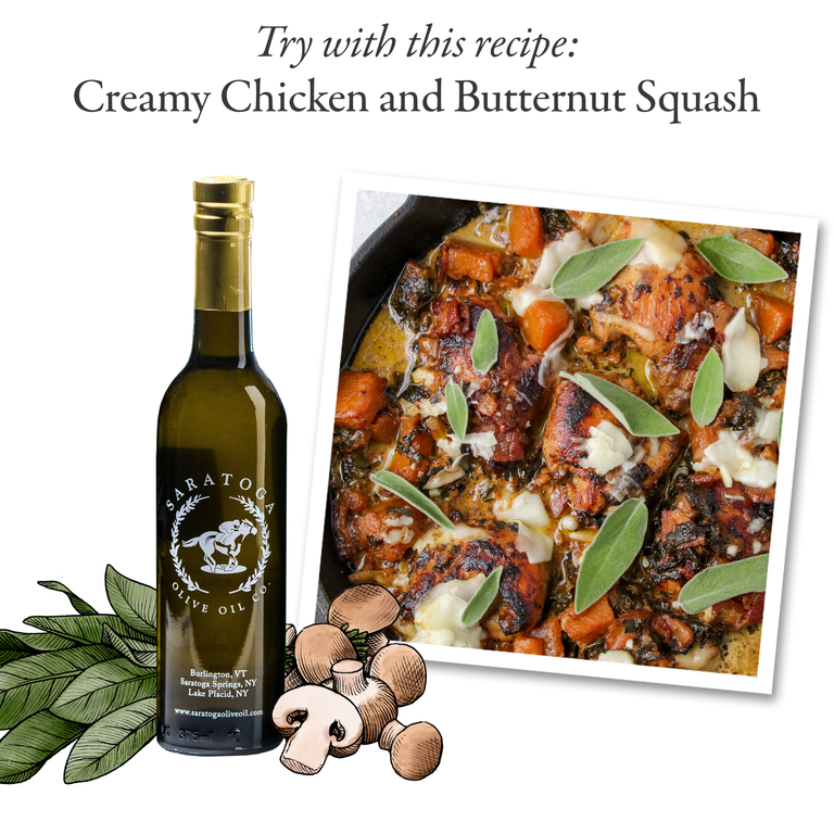 Arriving in layers of flavor, our Mushroom & Sage Olive Oil is heavenly on roasted sweet potatoes. Croutons crunch with the herbaceous flavor and a drizzle (or glug) adds pizazz to soups, stews, and savory chowders. This olive oil (when paired with our Cranberry Pear Balsamic Vinegar) takes poultry and pork to a whole new level! As a staple in traditional thanksgiving stuffing, you’ll be asked to bring the main side dish for years to come!
