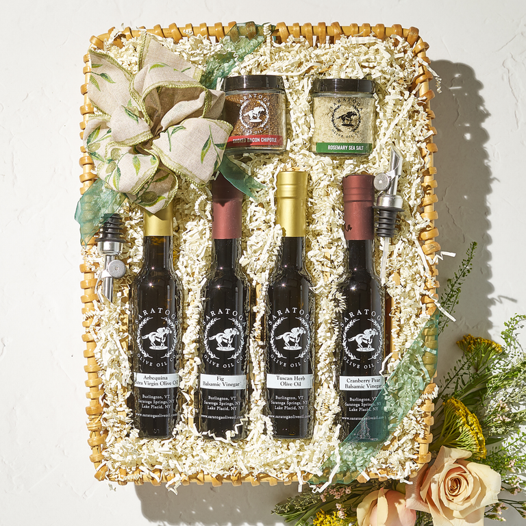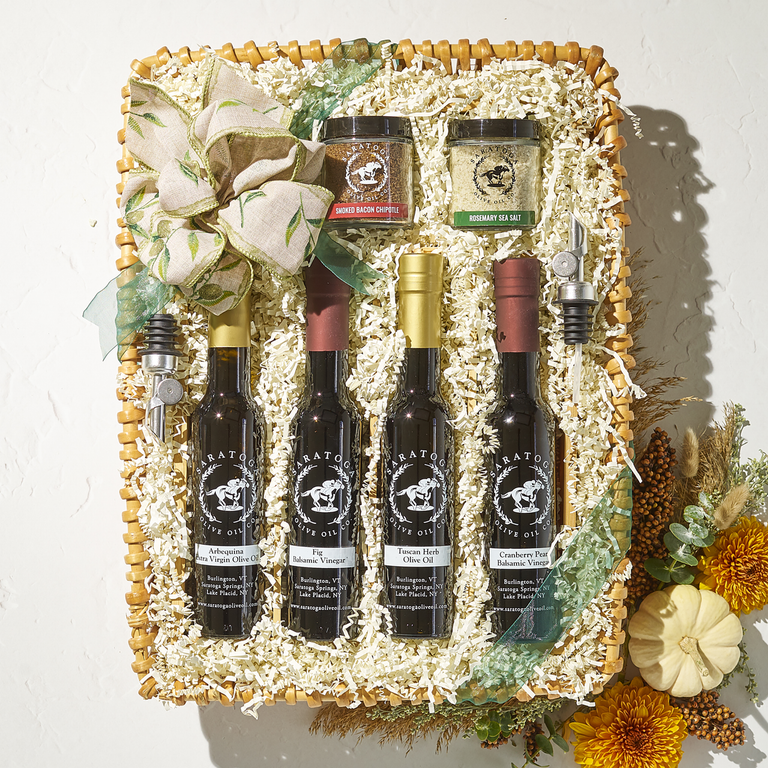 With every gourmet olive oil gift basket, you’re giving an exploration of two exceptional balsamic vinegars and two premium olive oils, all expertly chosen for their distinct profiles. Complementing this are two gourmet sea salts, adding that perfect touch of seasoning to any dish. To make the experience seamless, we’ve included two self-closing pour spouts ensuring precision with each pour. All these treasures come nestled within a beautifully crafted basket, reflecting the care and quality Saratoga Olive Oil Co. is renowned for. Whether you wish to convey gratitude, celebrate a milestone, or simply remind someone of their special place in your heart, the Finish Line Premium Gift Basket is the way to do it. And for those looking to embrace the spirit of the season, our limited ‘Fall’ edition beckons with exclusive flavors, all housed in vibrant, festive-colored bottles.