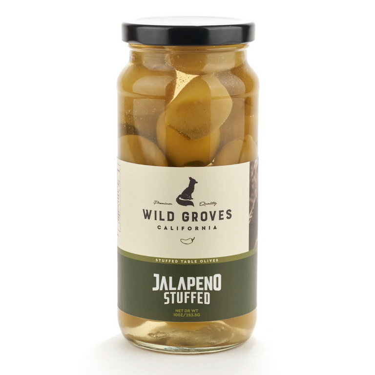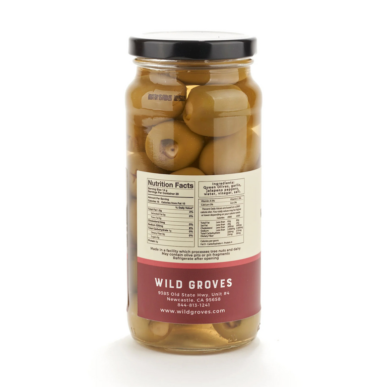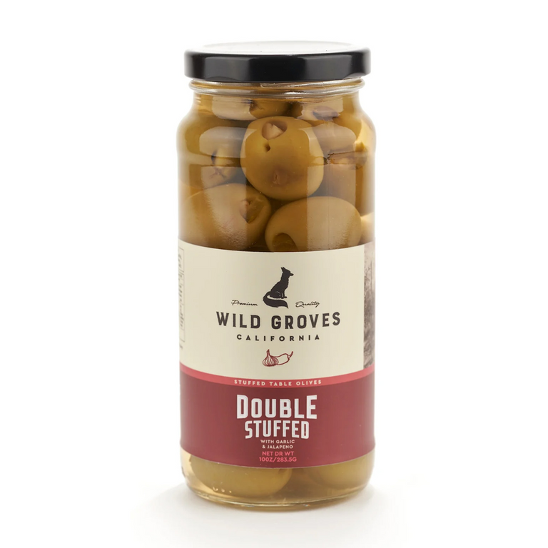 Double Stuffed Olives: Queen Olives, garlic, jalapeno peppers, water, vinegar, salt.