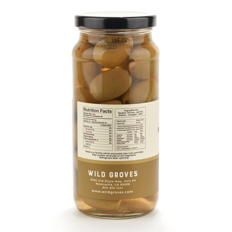 Garlic Stuffed Olives: Queen Olives, garlic, water, vinegar, salt.