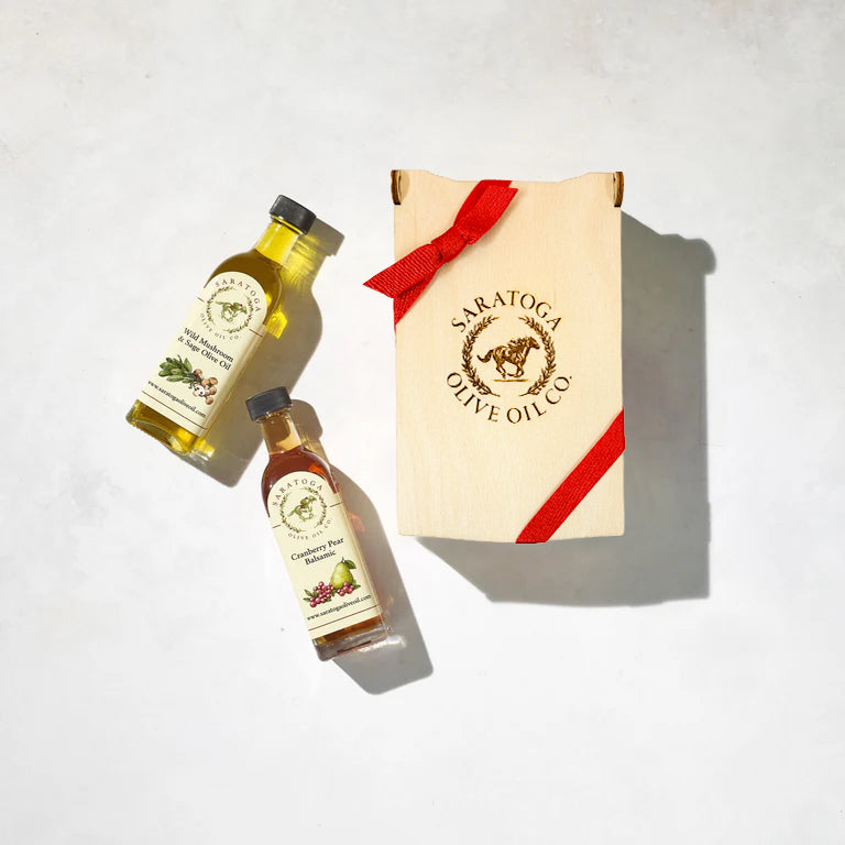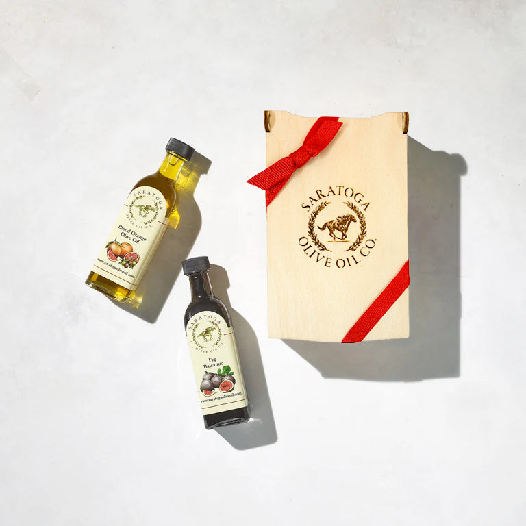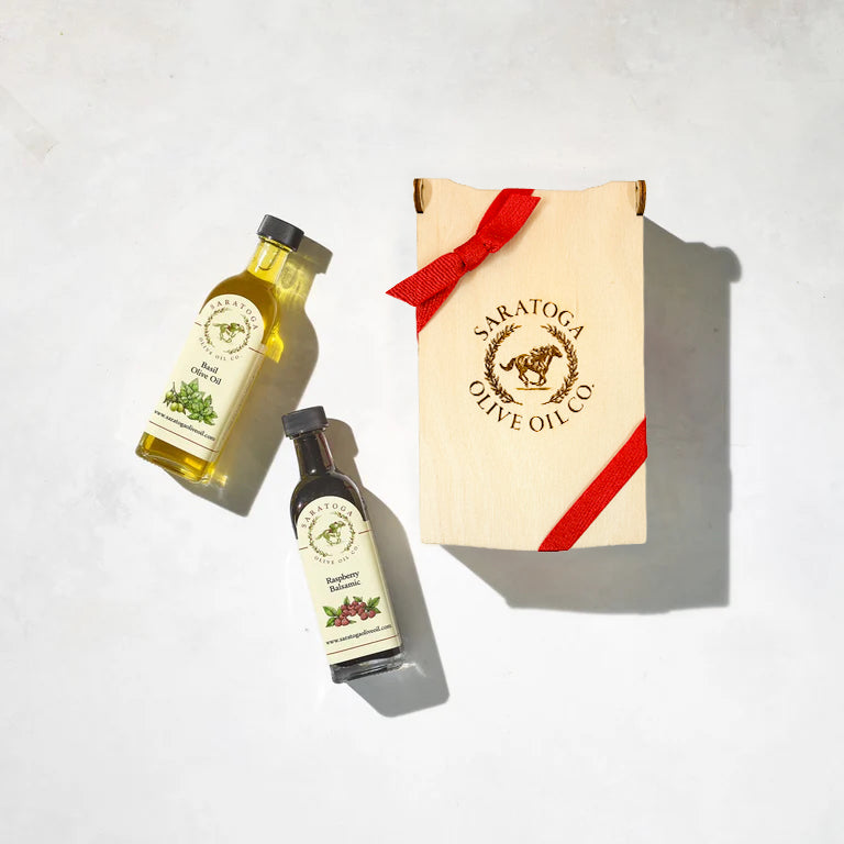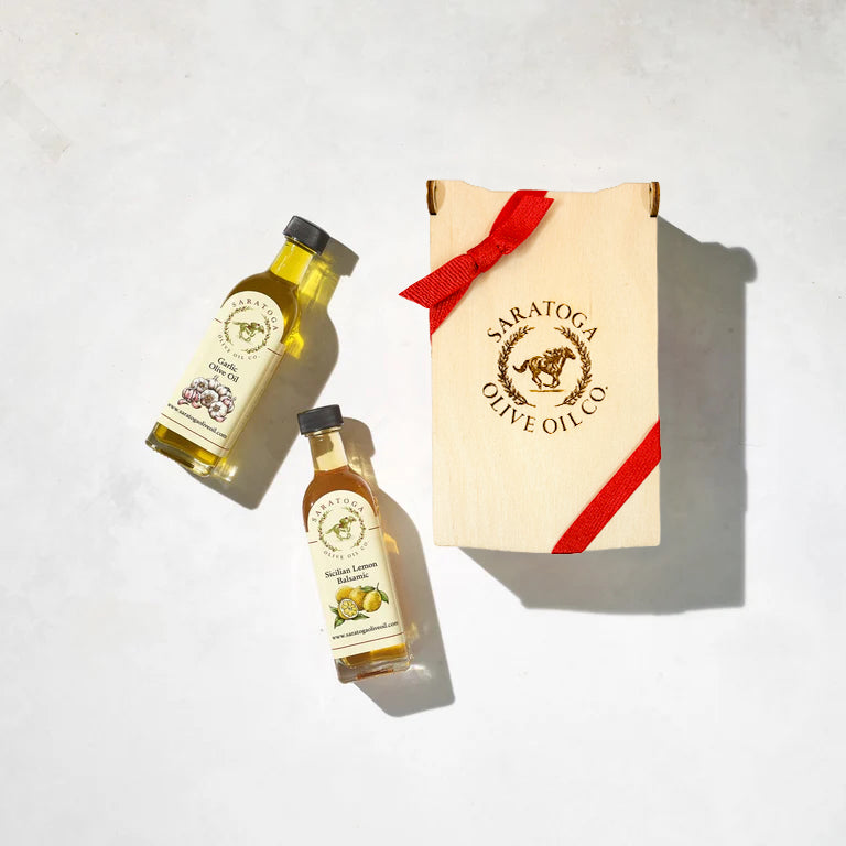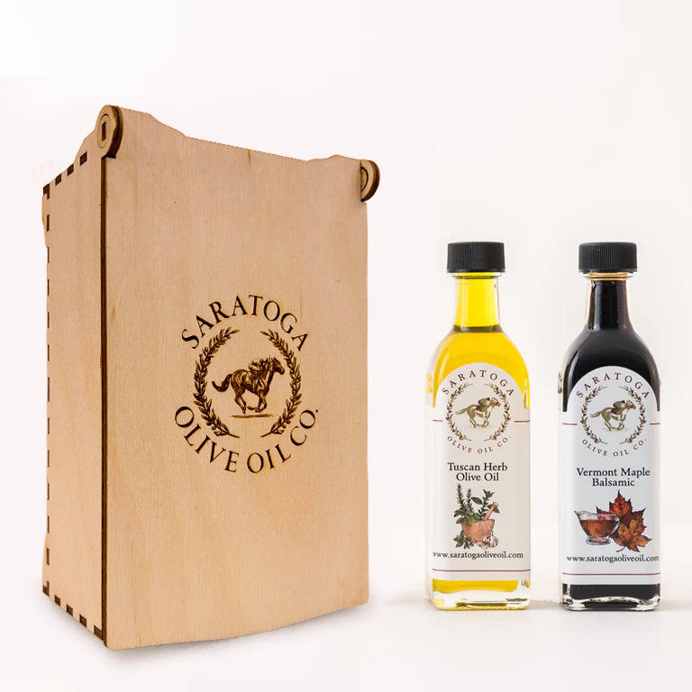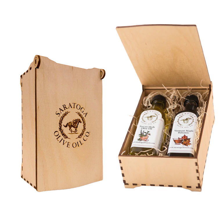 Saratoga Custom Engraving expertly brands each box with the Saratoga Olive Oil Company logo. Snuggled in comfortably are 2 of our 60ml bottles chosen by you! These are great additions to any kitchen as they make wonderful salad dressings yet can also be used alone for many different applications.
